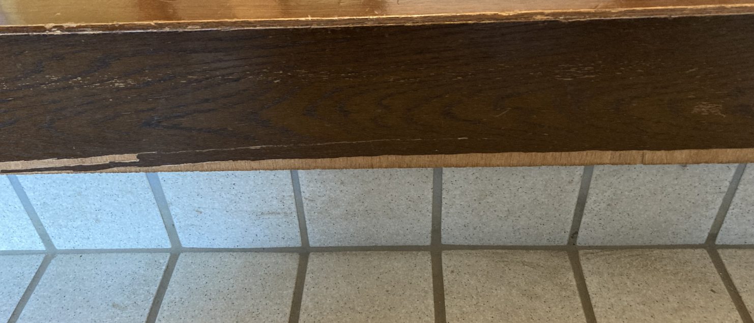 玄関の上がり框は、表面が剥がれ、下地のベニヤが見えています。