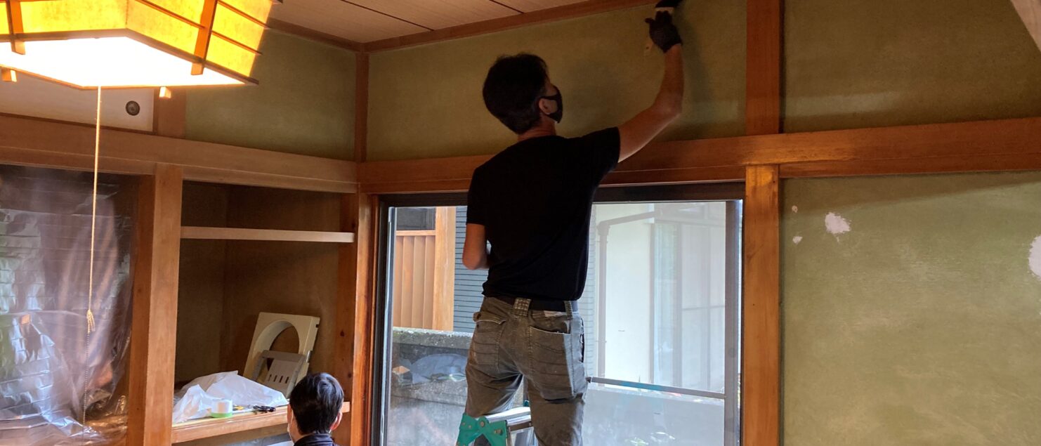 和室の壁を仕上げる前に、木部の、長年のアクによる汚れを取り除きます!