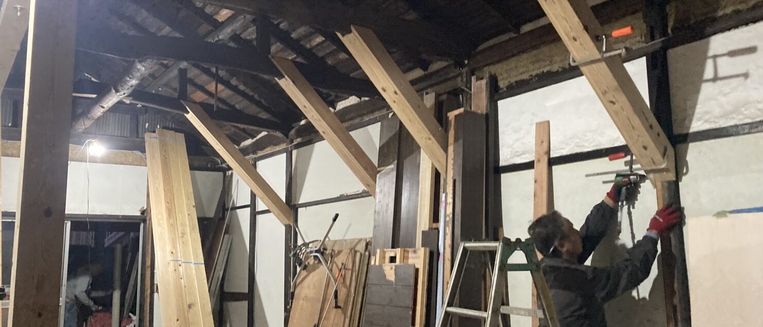 方杖で補強 2022年11月14日 ブログ 本日も喜多町で、飲食店のリノベーションです! 梁間方向には筋違などが全くないことから、方杖で横揺れを防止。だいぶ見た目もしっかりとしました! 今回は久々に、ハイビックさんの木材をたくさん、使わせていただいております。 ハイビックさんの木材は、質も良いので安心です^^ こちらが、ハイビック埼玉店。 材木がたくさん。プレカット工場もありますよ。 化粧梁の撤去 豊かな水辺