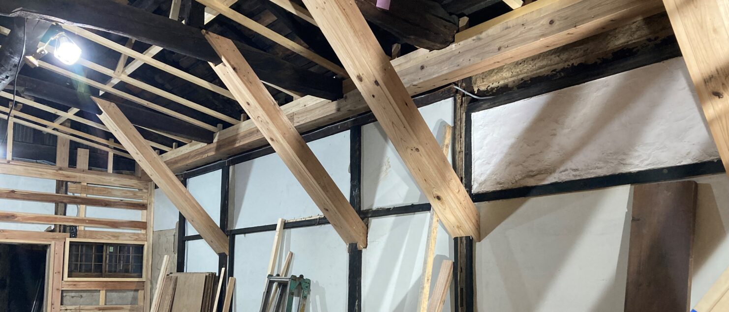 勾配天井製作 2022年11月25日 ブログ 喜多町の飲食店リノベ、本日は勾配天井の製作です! 既存の梁が丸太で雰囲気があるため、ぜひ見せたいというお客様のご要望を取り入れます。 勾配天井にすることで、梁をみせることが可能です。 天井と壁に少しずつ雰囲気が見えてきました^^ 浴室のシャワー水栓交換 仏壇スペースを考える