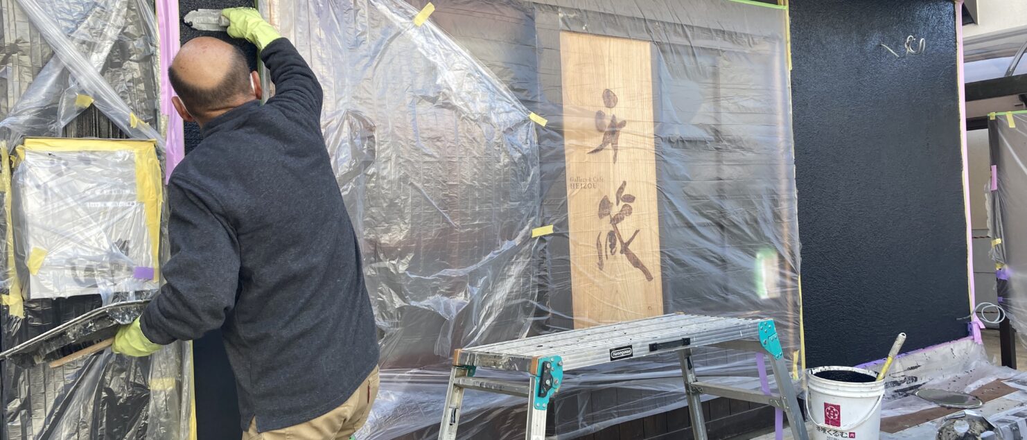 外部のジョリパットはスーパーブラック 2023年1月12日 ブログ 喜多町の飲食店リノベでは、ファサードもジョリパット。 内部は、「ブラウニッシュグレー」という、白系で明るくしましたが、外部は黒を基調としています。 選んだ色も、「スーパーブラック」。黒の中の黒って感じです。 今日は平沢さんにすべてやってもらいました! 僕は眺めていただけ^^; 夕方から内部で床の塗装で頑張りました^^/ ピッカピカです^^ 腰が疲れました^^; 「平蔵」看板の修復 ジョリパット仕上