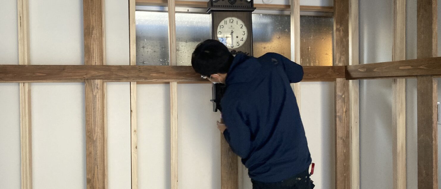 本日は、幸町のフォトブースの現場で、古時計とシャンデリアの位置をお客様と打合せをして、中道が取り付けてきました!