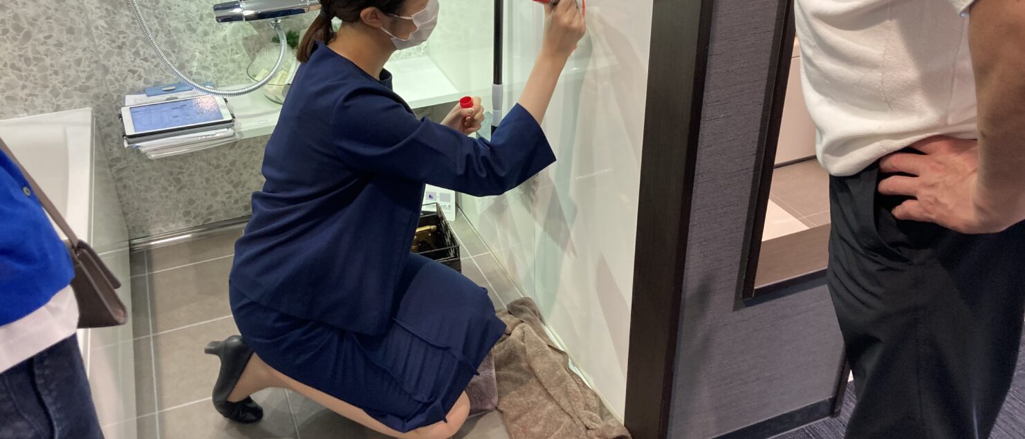 システムバスと、洗面化粧台とシステムキッチンを、ショールームスタッフの蓑(みの)さんに丁寧に説明してもらいました。御覧の通り、システムバスの壁はホーローパネルになっており、実演してもらいながら、説明を受けてきました。ホーローパネル、魅力的です^^