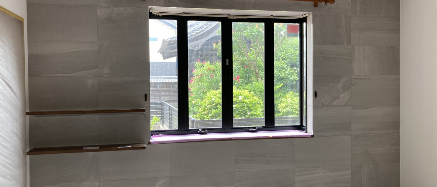 出窓側の壁一面にエコカラットを貼って、その周囲の天井と壁はクロス貼りで、仕上げました。