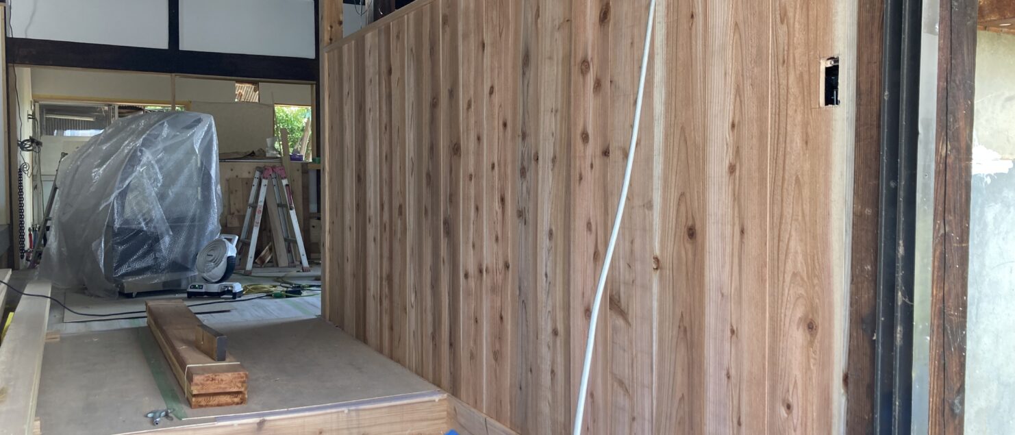 玄関と客室の間に間仕切製作 2023年7月21日 ブログ 川島の飲食店では、玄関と客室との間に立上り壁を造作。視線を隠すような高さにしました。 壁材は、杉の野地板を使用。乾燥材ではないので収縮が起きやすいですが、コストをおさえられるのと、荒っぽさが雰囲気出ますので、こちらを採用。あとで黒っぽく塗装する予定です! 縁側の掃き出し窓はアルミサッシを外し、木製引戸が入れられるように、造作中です! 明治時代の建物でした。 今日も暑くなりそうです💦