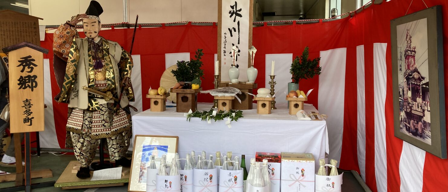 我ら喜多町は山車を出さないため、秀郷の人形も会所で各町内の山車を迎え入れます。我らも各町内の山車を迎え入れるため、喜多町の衣装を着ます。