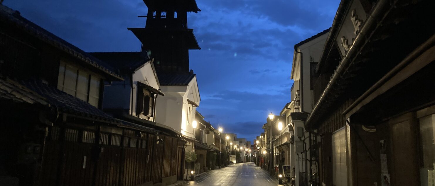 鐘つき通りの空は、なかなか綺麗な群青色で、道の石畳も雨で濡れて綺麗でしたね。