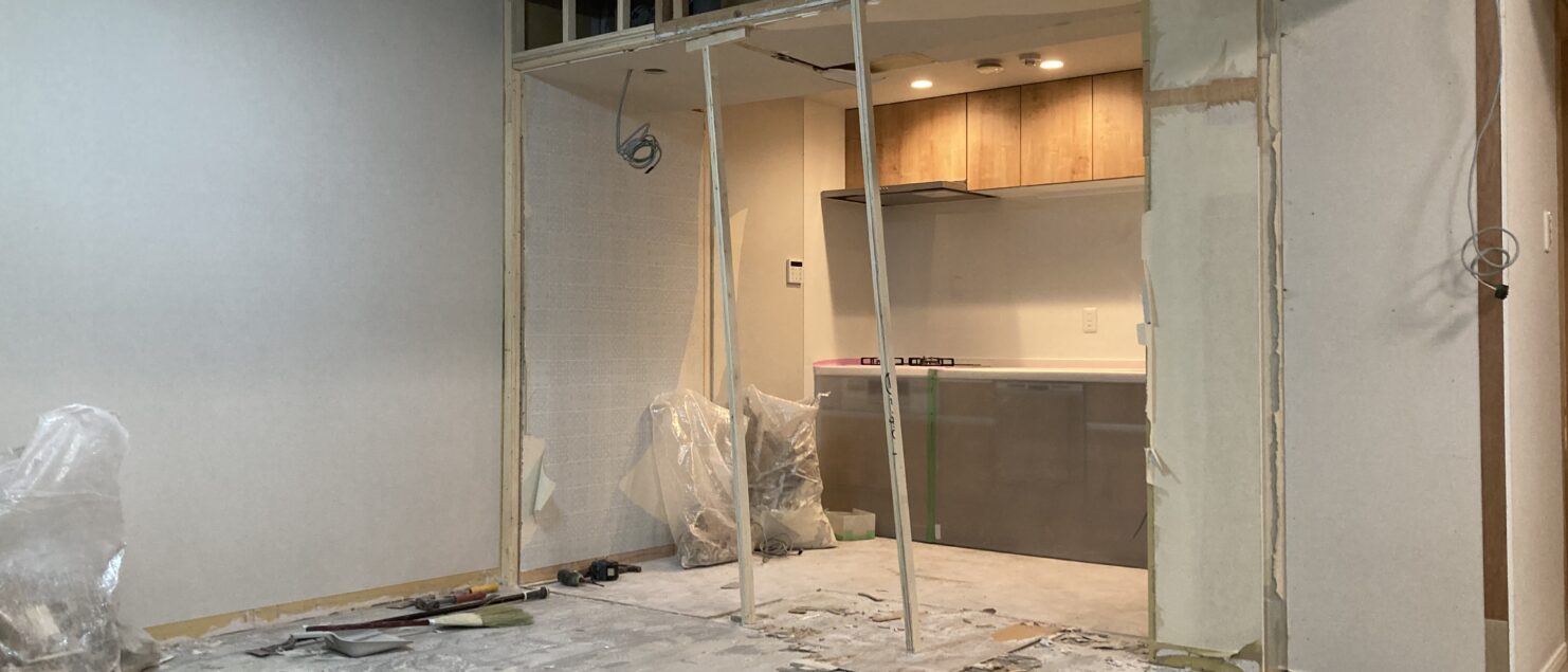 大工工事、真っ最中。キッチンと個室を繋げて、ダイニングキッチンを作っております。