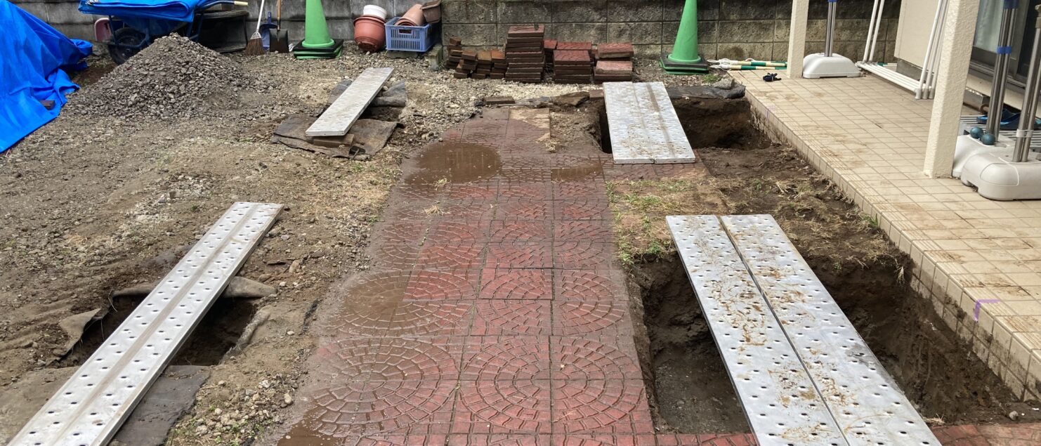 今週から始めた、志多町のお宅のカーポートの工事、本日、足元のコンクリート打設も終わり、コンクリートの強度が上がるまで、仮に垂木で補強して置きます。