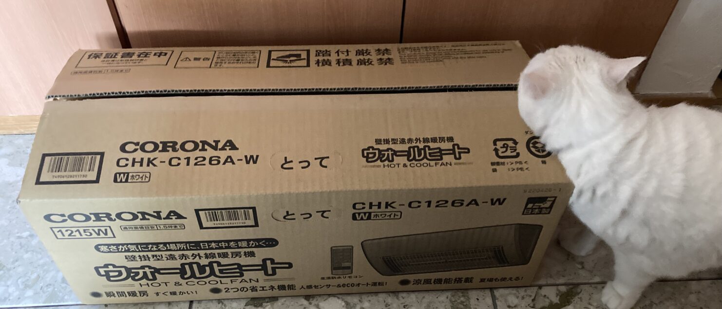 さあ、付けようとすると、猫のクウが梱包の段ボールに早くつけてと言わんばかりに、すりすり。