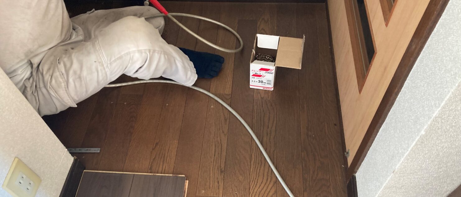 フローリングの補強 2024年9月9日 ブログ 本日は、志多町のお宅にて、玄関上がった所の床の補強として、フローリングの上張りを行いました。 まずは、ギシギシする床鳴りを何とかしないといけません。ビスで床鳴りを防止する補強を行いまして、床鳴りがしなくなったら、フローリングの上張り作業を行っていきます。 最後の張りじまいはどうしても接着に頼らなければならないため、いろいろな圧着方法を駆使して張り終わりました! さすが、佐々木大工さん。綺麗に仕事してくれますね^^ トイレリフォーム 浴室リフォーム着工!