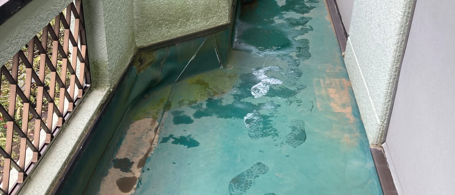 先週から始めている外装工事では、バルコニーが雨漏れしており、改修を行います。
