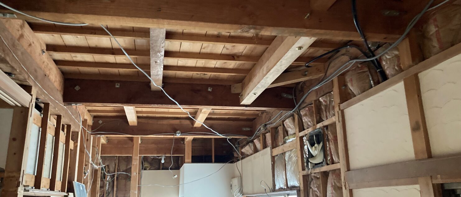 床を壊す前に、床があるうちに天井を解体して、天井を造作。天井は構造用合板を採用!3’×6’板を半分にして市松張りに。