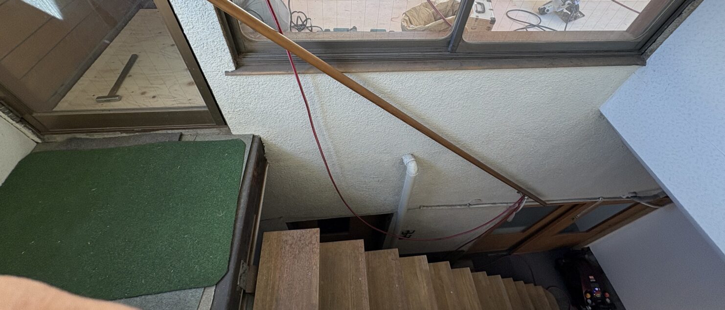 階段もグラグラで、しかも手すりが離れているので危ない状況。吹き抜けている部分をふさいで、階段のぐらつきも直すのが目的ですが、せっかくですので、補強しつつ、使いやすい階段にリノベーションしたいと考えました。