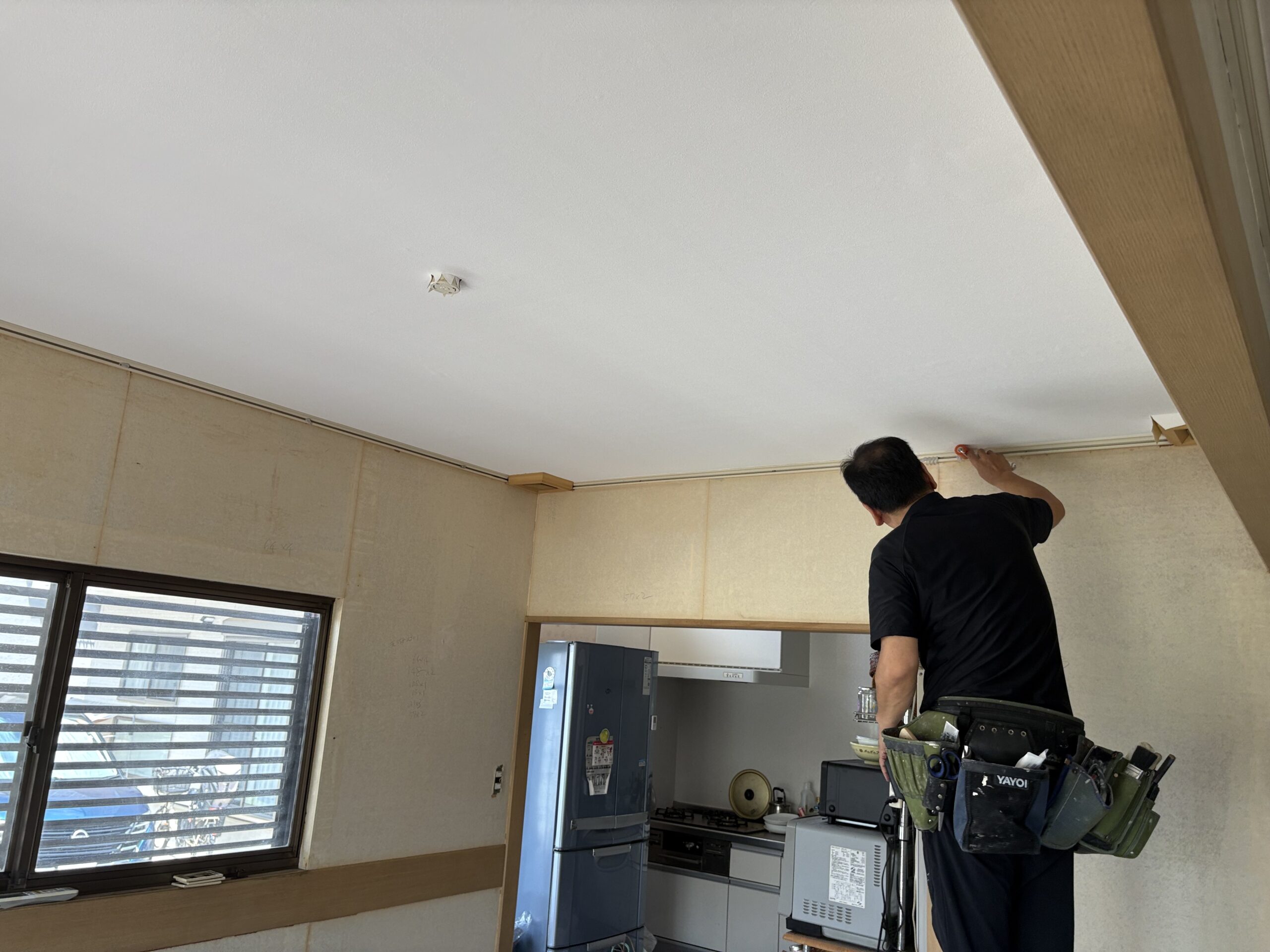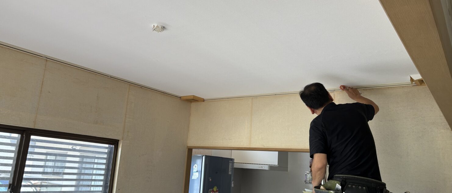 天井と壁のビニールクロスの貼替とカーテンレールの交換です。内部ですが、エアコンを使わせて頂き、クロス職人の松本さんも快適に仕事が出来ました。お客様に感謝です^^