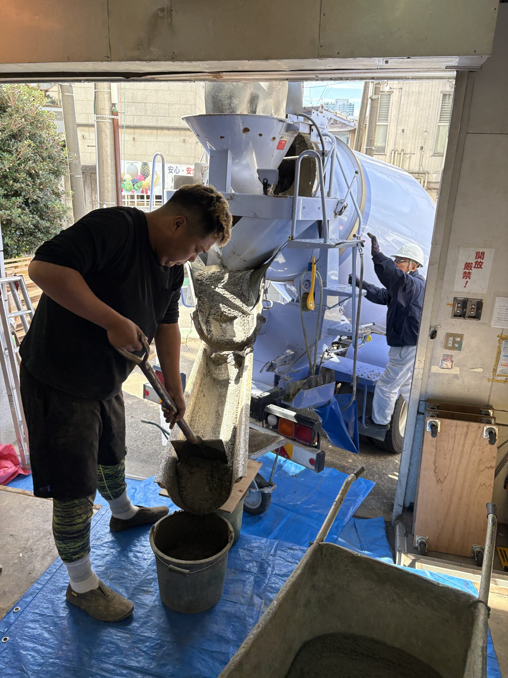 生コン車のシュート部分の高さが足りず、バケツで受けることに。ちょっと大変でしたが、私も含め、4人で頑張りました!