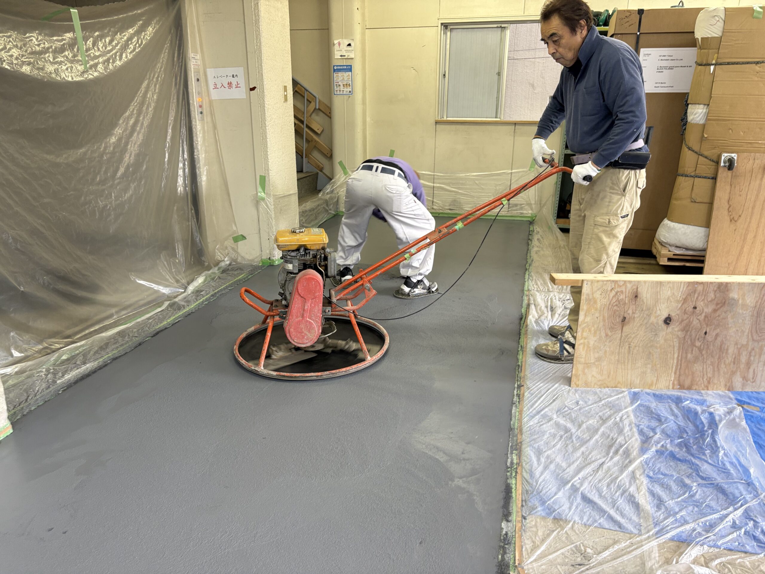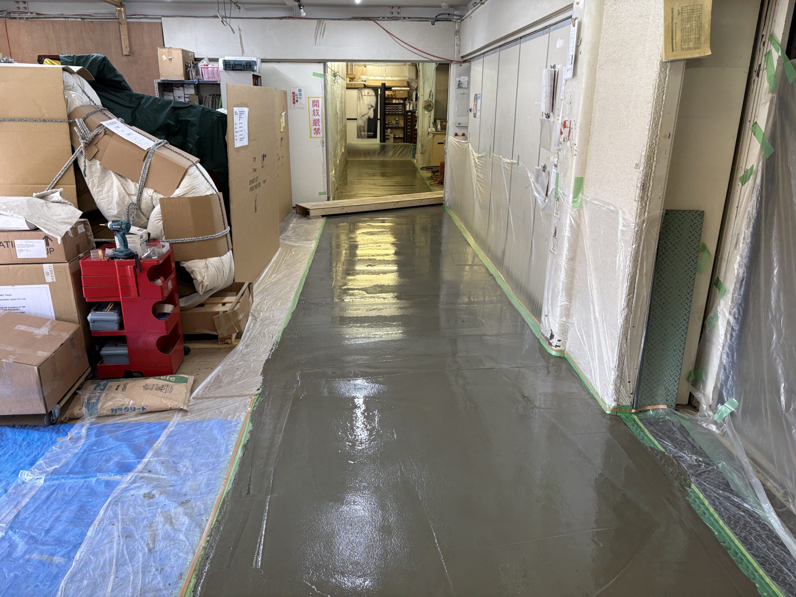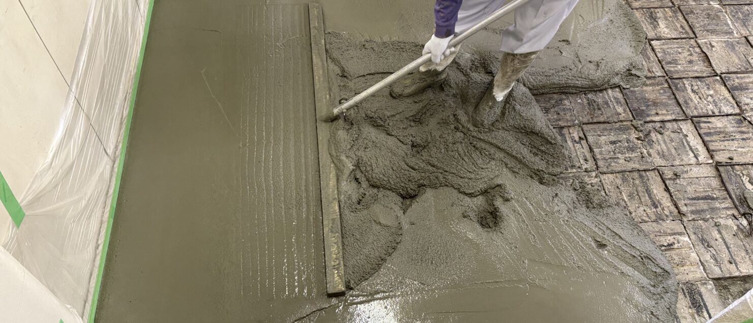 これから、少し時間をおいて、「カラクリート」という色粉を撒いて表面の強化を行います!工場などの床で使ったりするものです。こちらの工房では、グレー色を採用。