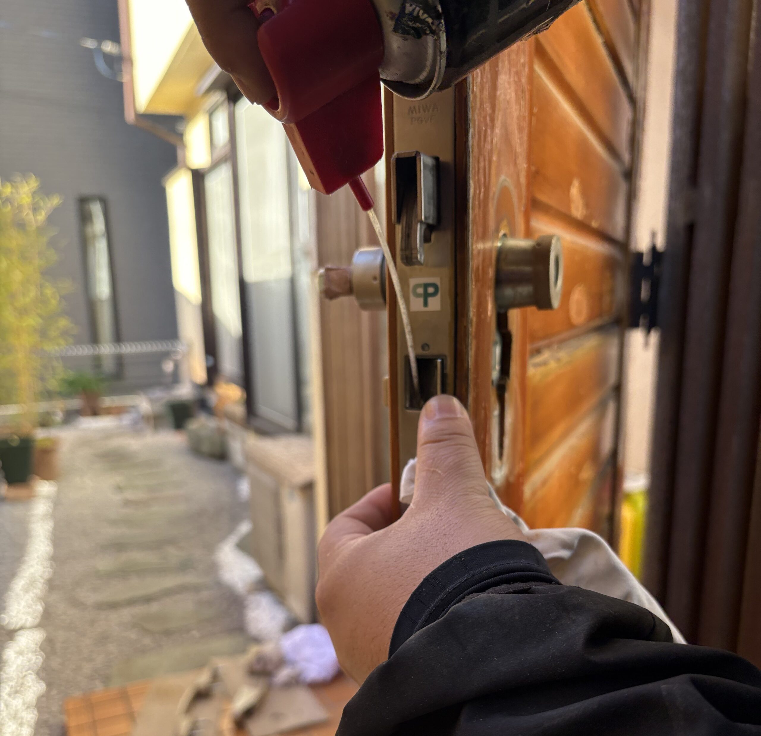 玄関ドアハンドルのメンテ 2026年1月6日 ブログ 本日は、上尾市のお宅でにて、玄関ドアハンドルのメンテです。ハンドルの鍵の掛かりがあまり良くないとのことで、ラッチのところからオイルスプレーを充填して、汚れを取り除くと同時に、滑りを良くしました。 年明け早々、なぜか建具がらみが続いてますね。 本日は、午後からは事務所仕事。近所の平蔵さんで、きりたんぽ鍋を頂きました😋 胃袋が整いました^^ ポーチの階段リフォーム 戸車の確認
