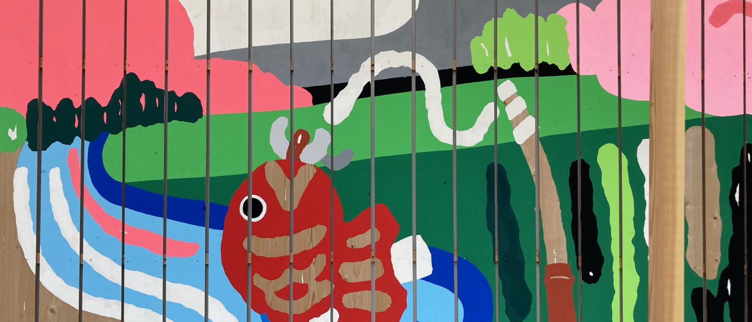 隣の氷川会館では、解体作業が終わり、建て替え工事を始めているようですが、先日組まれた木製仮囲いが、華やかになっていました。