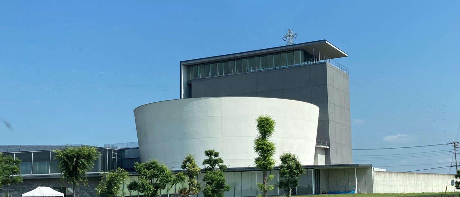 建築家フランク・ロイド・ライトが設計した、ニューヨークのグッゲンハイム美術館を連想させるような、円錐形と直方体を組み合わせたデザインで、吉見の田園風景に現れるこの形がとても目立ちます!