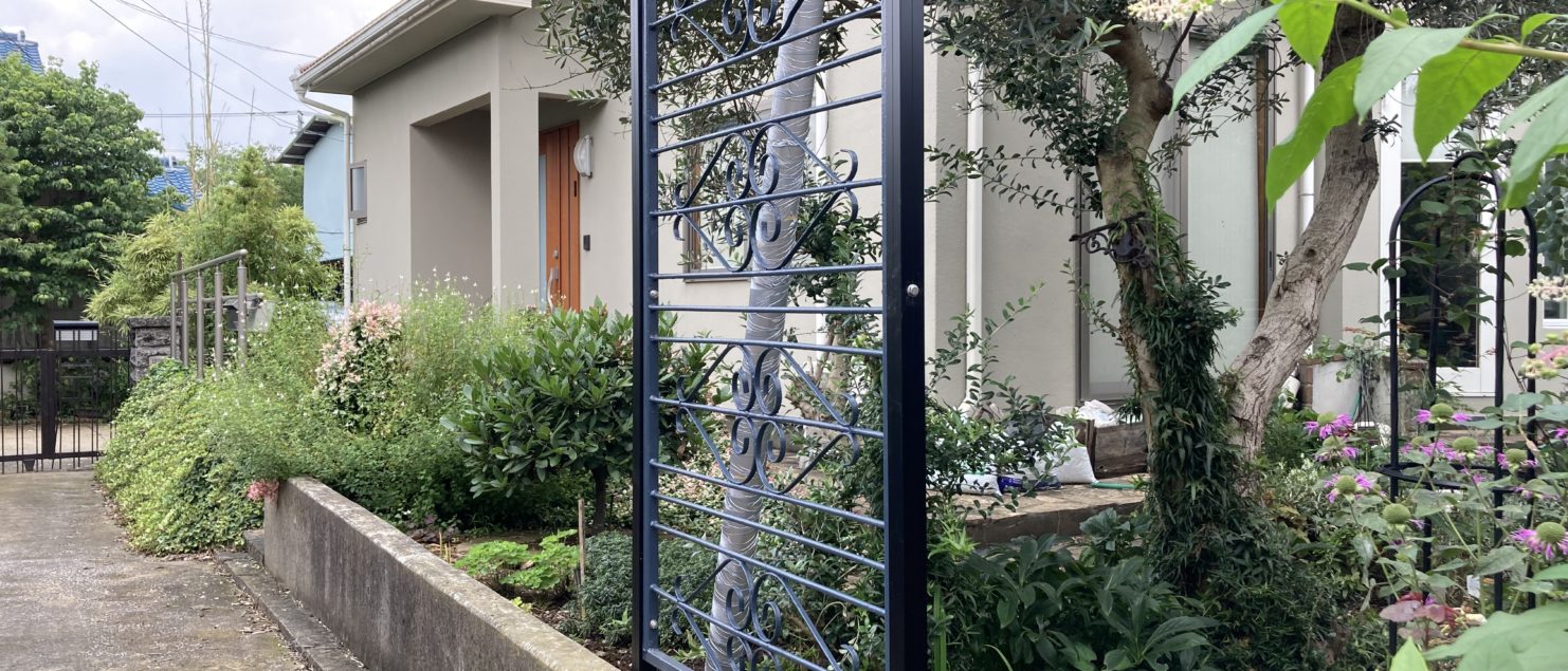 横長で使用していたアンティークな鉄製門扉を、縦長に使い、フェンスとしてよみがえらせました。