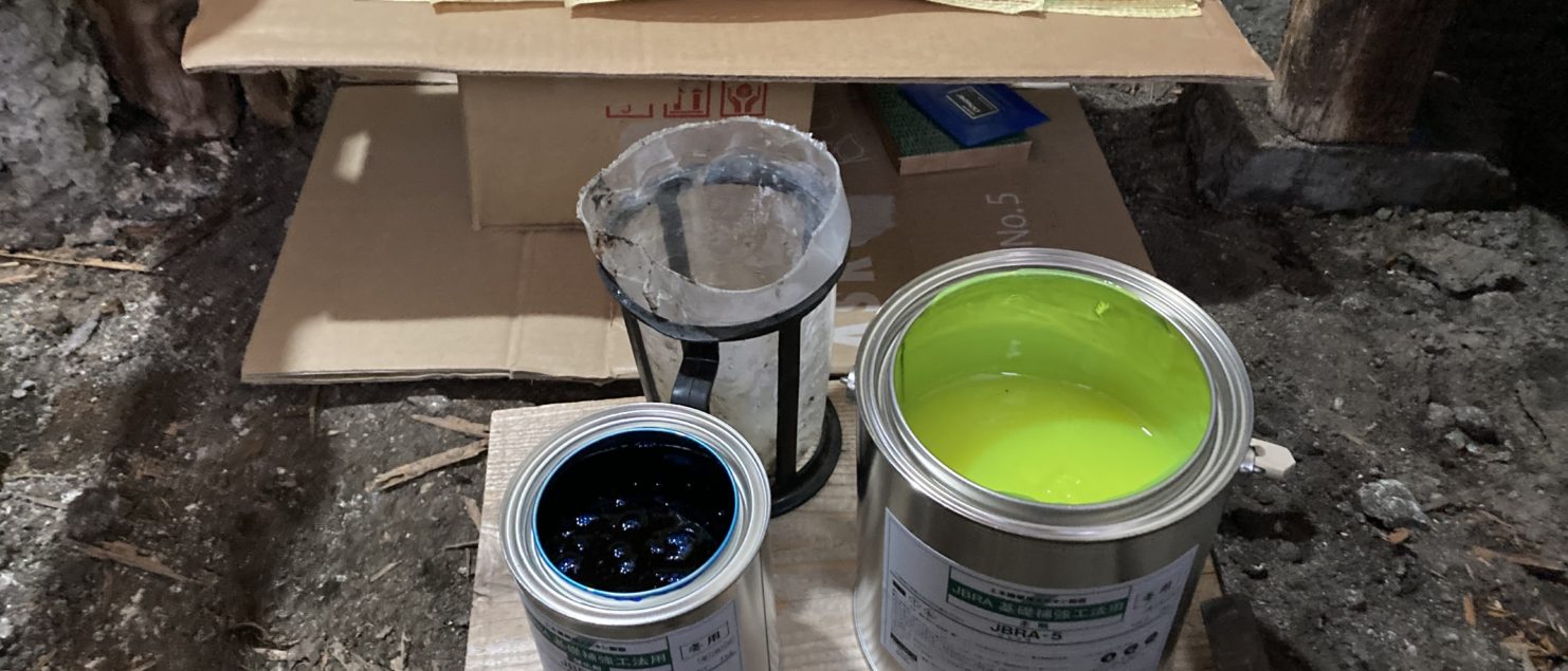 アラミド繊維シートにエポキシ樹脂の接着剤(2液タイプ)を塗布して、基礎を補強します。