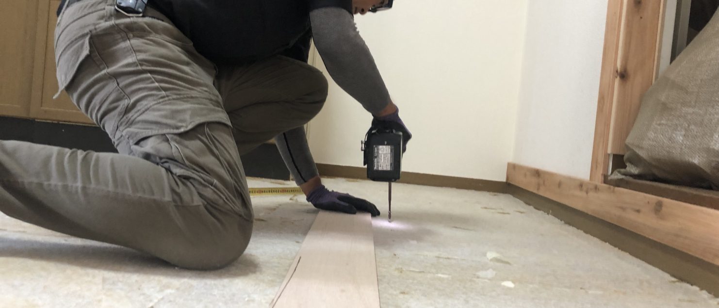 床が、ギーコーギーコーと釘がすれる音があちこちでなっていたので、既存のクッションフロアを剥がした後、ビス止め補強をして、床鳴りを防止しました。