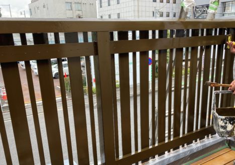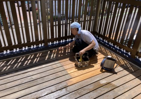 元町でバルコニーの木部を塗装しています。 手すりの塗装が終わり、床面のデッキを補修し、塗装してもらい...