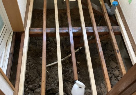 石原町で洗面所の床工事を行いました! 長年、沢山踏まれる床を中心に、合板が根太と根太の間でたわみだし...