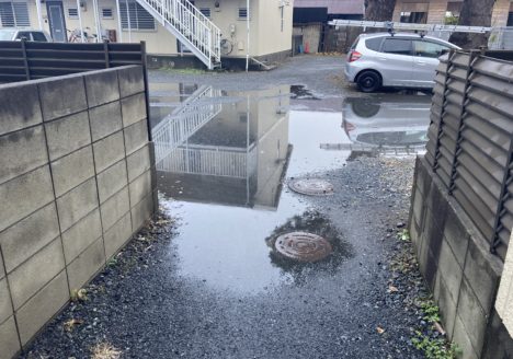 今日は喜多町のアパートの駐車場の水溜りをなくす砂利敷を行いました。 ご覧の通り、大雨になるとこんな感...