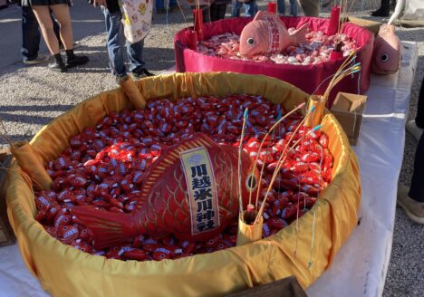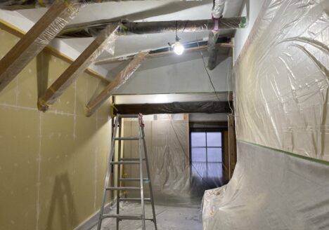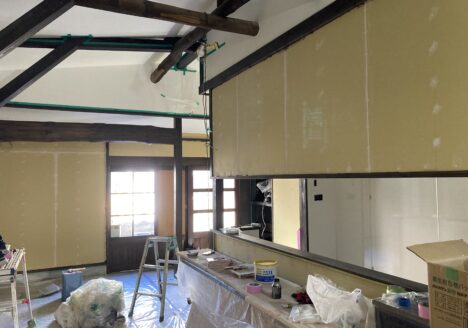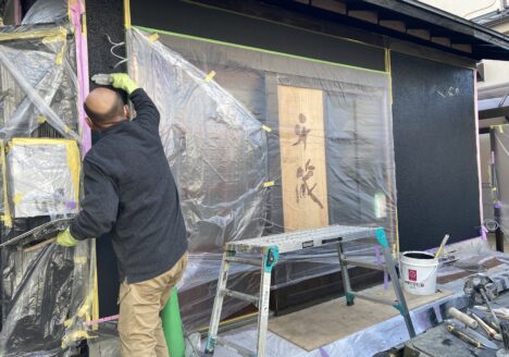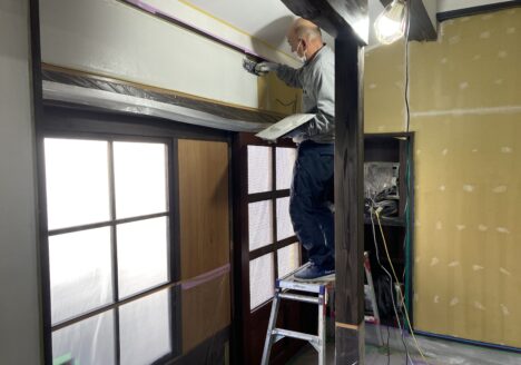 喜多町の飲食店では、1月4日に大工さんが造作する前に、天井の塗装を行います。 現場の外では、川越氷川...