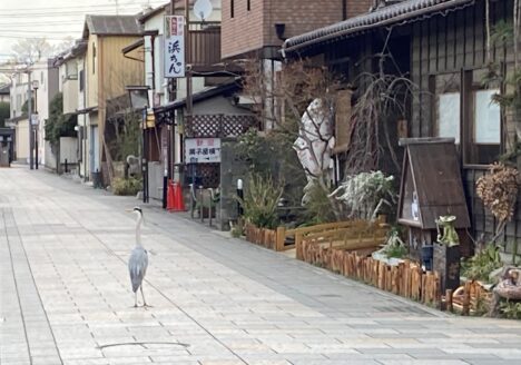 今朝、ふくまる店長と、いつものルートで歩いていると、見慣れないサギを発見! 近くの料亭で泳いでいる鯉...