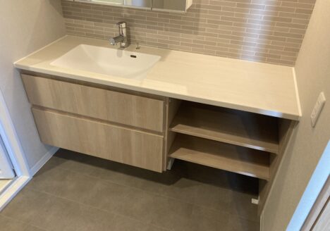 本日は、ふじみ野のマンションにて、洗面化粧台の棚の部分に扉をつけてきました! このような綺麗な洗面台...