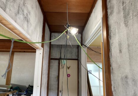 宮下町の空き家リフォームでは、廊下の繊維壁に壁紙が貼れるように、下地合板を張ります。ただ、繊維壁表面...