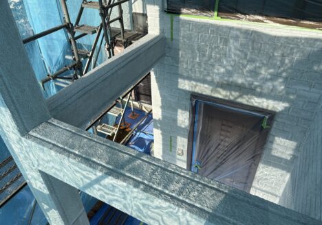 先週から始めている外装工事では、バルコニーが雨漏れしており、改修を行います。 外壁が変色している部分...